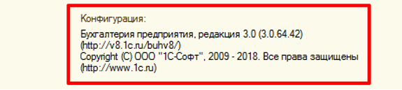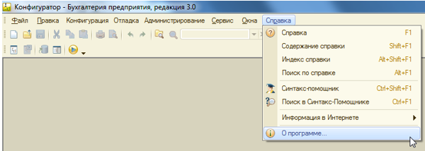 Также нам необходимо точно знать, какая версия конфигурации установлена у нас на данный момент. Для этого в меню открываем пункт “Справка” и в выпадающем меню переходим в пункт “О программе…”