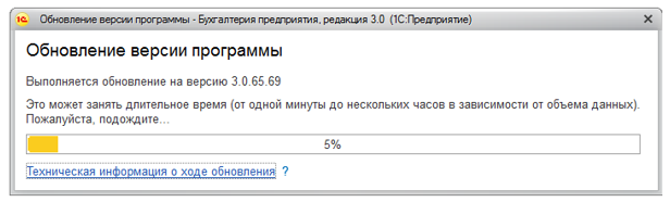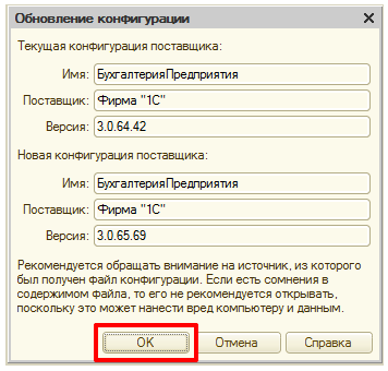 После будет открыто окно с информацией о текущей версии конфигурации и версии, которая будет установлена после обновления. Нажимаем “Ок”;
