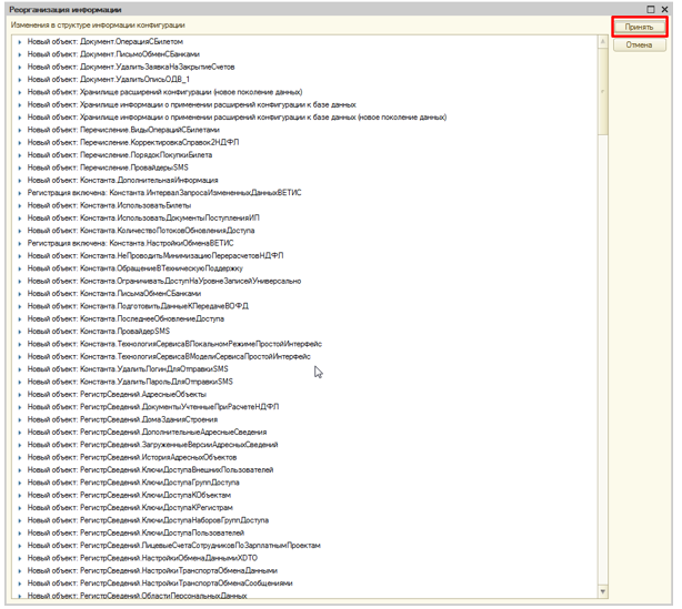 Снова ожидаем кнопку “Принять”, ознакомившись с изменениями в конфигурации. В случае возникновения предупреждений просто жмём “Да”;