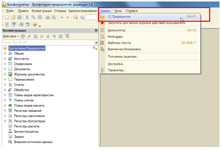 Теперь нам необходимо запустить программу в пользовательском режиме. Для этого мы можем воспользоваться комбинацией клавиш Ctrl + F5 или же выбрав пункт “1С: Предприятие” в разделе “Сервис”;