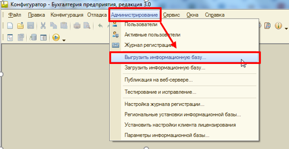 На верхней панели нажимаем кнопку “Администрирование” и в выпадающем меню выбираем “Выгрузить информационную базу”.