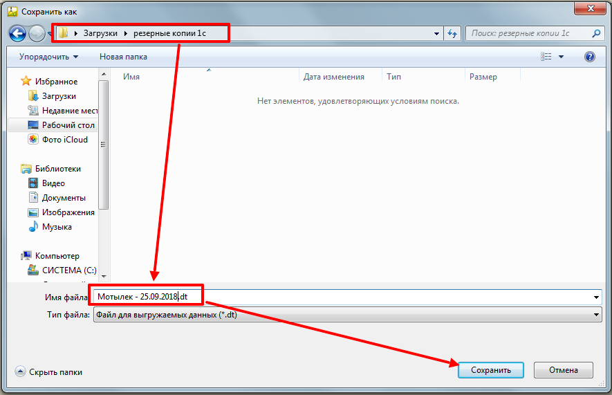 В открывшемся окне выбираем место сохранения файла с выгрузкой. Для удобства рекомендуем создать папку с соответствующим названием (например, “Копии 1С”).
