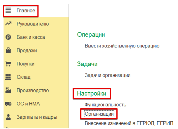 Для создания обособленного подразделения в программе 1С:Бухгалтерия повторим начальные шаги из описанного выше примера, перейдя из меню "Главное" в раздел "Настройки" и выбрав пункт "Организации".