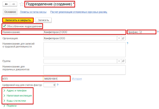 Далее заполняем данные по новому подразделению. Для начала, установим галочку «Обособленное подразделение в 1С 8.3», программа предложит к заполнению дополнительные пункты. Укажем наименование и КПП создаваемого подразделения, префикс для документов и код для счетов-фактур, адрес и телефон, налоговую инспекцию, и так далее. Нажимаем кнопки «Записать и закрыть» или «Записать».