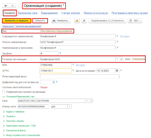 Следовательно, все заполнено верно. Далее, все реквизиты указываем, как для отдельного юридического лица, в соответствующих закладках. Нажимаем кнопки «Записать» или «Записать и закрыть».